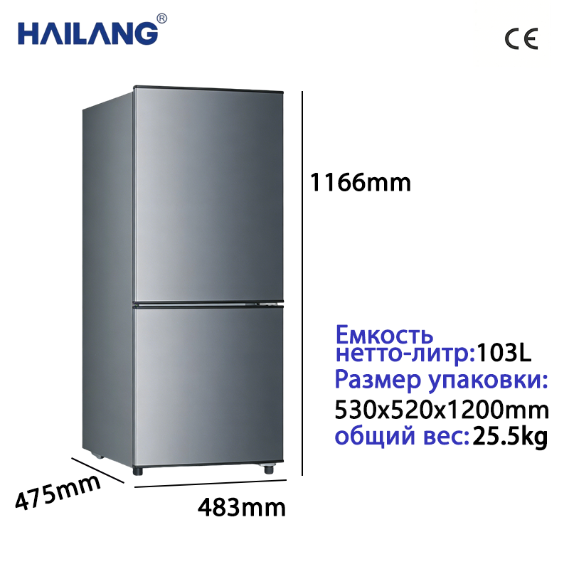 103 升小型双门冰箱,整机尺寸为 483mm×475mm×1166mm,毛重 25.5kg,小巧轻便不占空间,适配租房、宿舍、小户型等场景。底部配有可滚动轮子,移动灵活,摆放位置可随心调整。