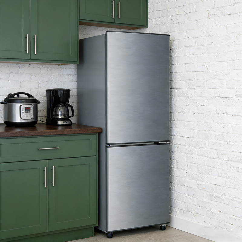 双门冰箱179 升,整机尺寸为 510mm×530mm×1521mm,毛重 42.5kg,体积适中不占过多空间,适合租房、小户型或两口之家使用。底部配有可滚动轮子,移动灵活,摆放位置可随心调整。