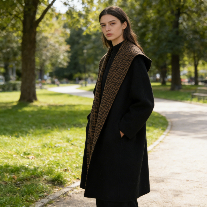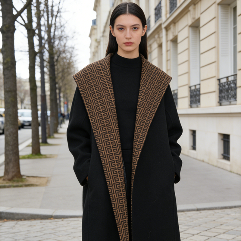 Тщательно продуманный крой и роскошные детали подчеркивают женский шарм и изящество, а широкий воротник с лацканами служит ярким акцентом. Это пальто легко сочетается с платьями, юбками или брюками, создавая универсальные образы для повседневной носки и торжественных случаев.