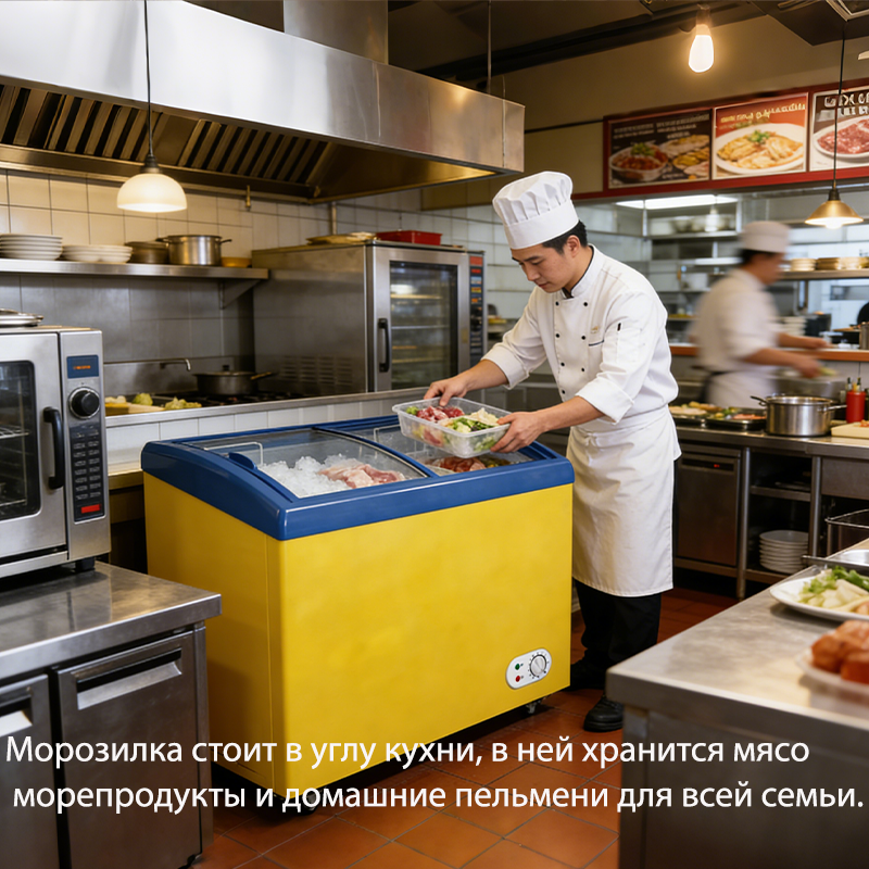卧式机身设计,横向空间利用率高,大容积不占过多空间。双弧形透明玻璃门搭配黄蓝配色,醒目吸睛,兼具展示性与美观性,适配各类商铺风格。门体密封胶条加厚设计,冷气流失少,减少能耗。底部带滚轮,移动灵活,便于清洁和位置调整。加厚发泡层箱体,保温性能优异,减少压缩机频繁启动,进一步提升节能表现。