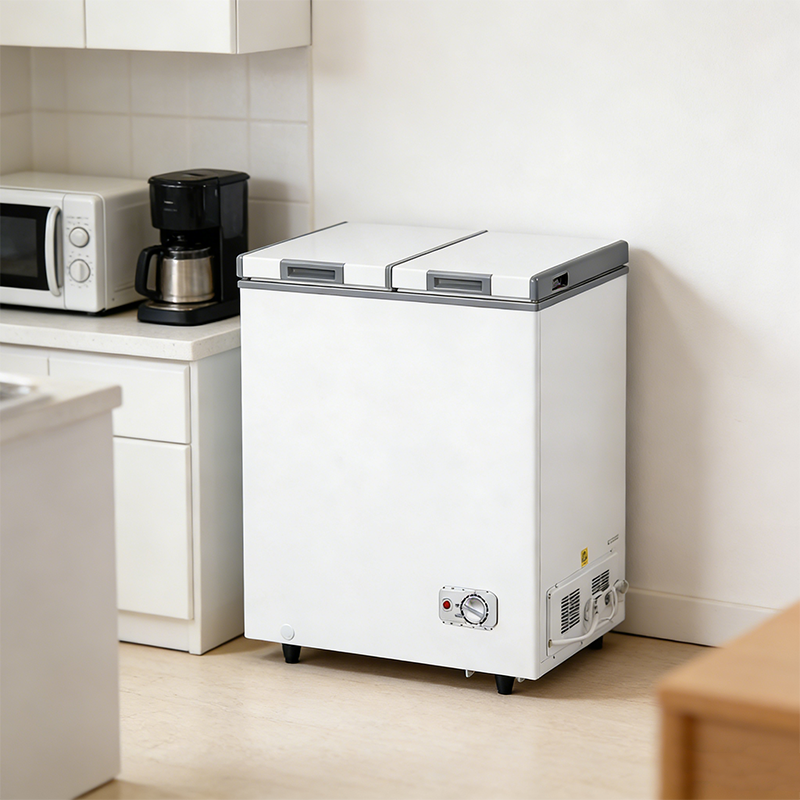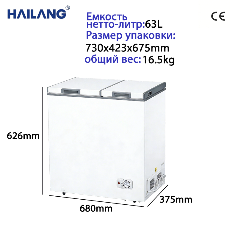 冷柜采用双温双门设计,总容量 63L,可实现冷藏与冷冻分区使用,满足家庭对不同食材的保鲜需求。整机为卧式造型,尺寸 680×375×626mm,毛重 16.5kg,体积小巧不占用过多空间,适配厨房角落、租房等场景。它配备机械控温旋钮,操作简单易调节,运行稳定且噪音低,通过 CE 认证保障品质,兼具实用性与空间兼容性,是家庭食材储存的实用补充电器