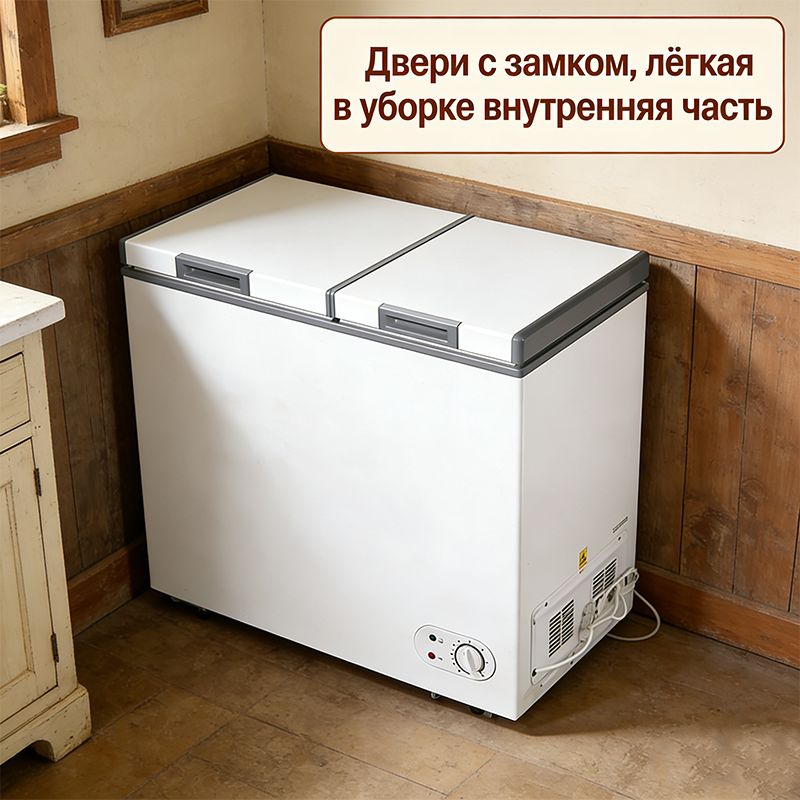 整机为卧式造型,尺寸 1150×560×840mm,毛重 49kg,布局规整且容量充足,适合放置于厨房、储物间等空间。它配备机械控温旋钮,操作简单易调节,运行稳定且噪音较低;产品通过 CE 认证,品质有保障,兼具大容量与实用功能,是家庭及小型商用食材管理的高效电器。