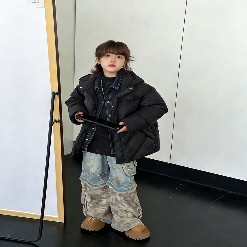 这款儿童假两件羽绒服以浅灰色为主调,拼接牛仔纹内领设计,打造层次感潮流造型,男女童同款适配多种穿搭。宽松落肩剪裁不束缚孩子活动,连帽设计紧密贴合头部,有效防风锁温。高蓬松度羽绒填充,锁温保暖效果优异,轻松应对冬日低温。表面采用防泼水面料,日常出行无惧雨雪污渍,一擦即净更省心。内里亲肤柔软,呵护孩子娇嫩肌肤,无论是上学还是户外游玩,都是孩子冬日保暖的个性之选。