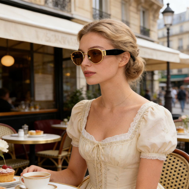 这款太阳镜采用轻奢金框椭圆设计,金属镜框搭配柔韧黑镜腿,兼具复古质感与轻奢风格,椭圆框型可修饰脸型,打造显脸小的视觉效果。镜片为偏光材质,具备 UV400 防护与防眩光功能,可有效阻隔紫外线、过滤强光,提升视野清晰度,多色镜片可选(黑 / 茶片)适配不同穿搭风格。镜架细节贴心:金属镜框稳固耐用,柔韧镜腿贴合耳型,佩戴舒适无压感,是日常通勤、出游防晒、复古造型的实用配饰。