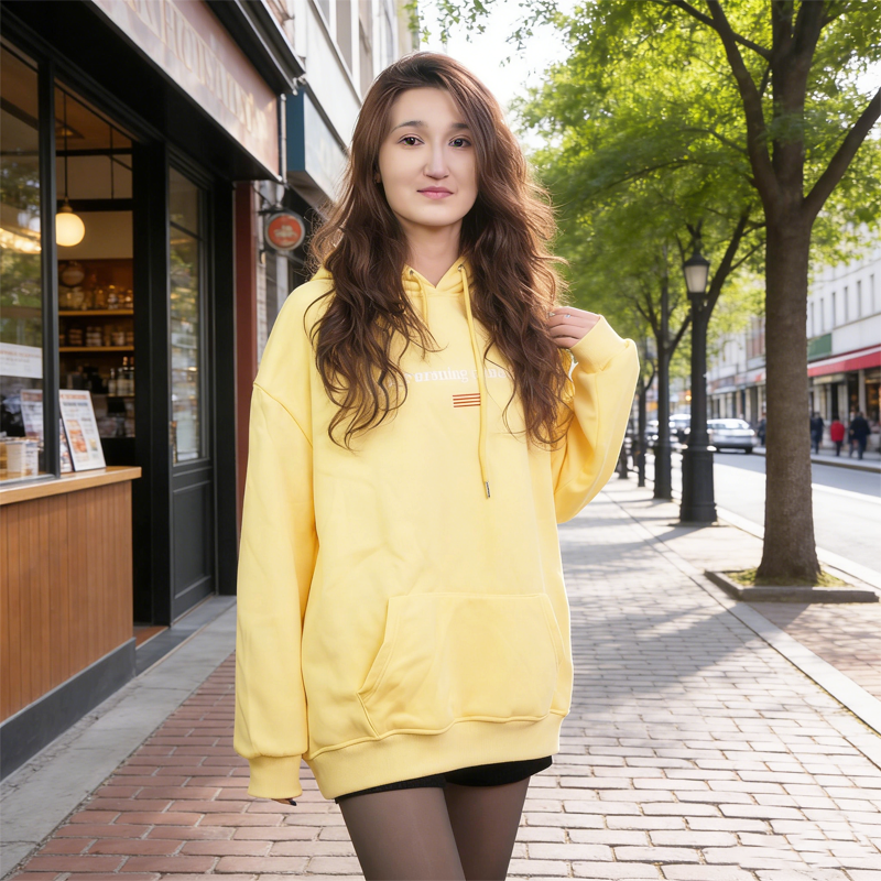 黄色新款连帽卫衣女百搭高街宽松上衣,剪裁利落不紧绷,包容各种身材,遮肉显瘦不挑人,无论是内搭还是外穿都适配。连帽设计,简约大气,不易过时;精致车线工艺,领口、袖口、下摆做工扎实,久穿不易松垮变形,简约百搭,轻松搭配牛仔裤、休闲裤、半身裙,适配日常通勤、校园穿搭、休闲出游等多种场景。